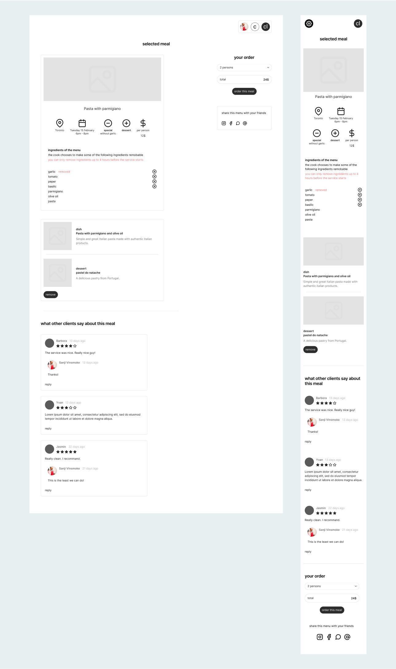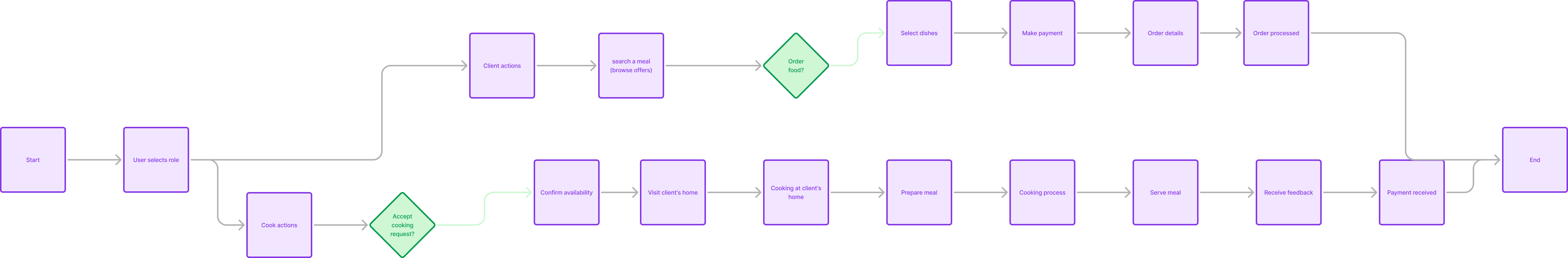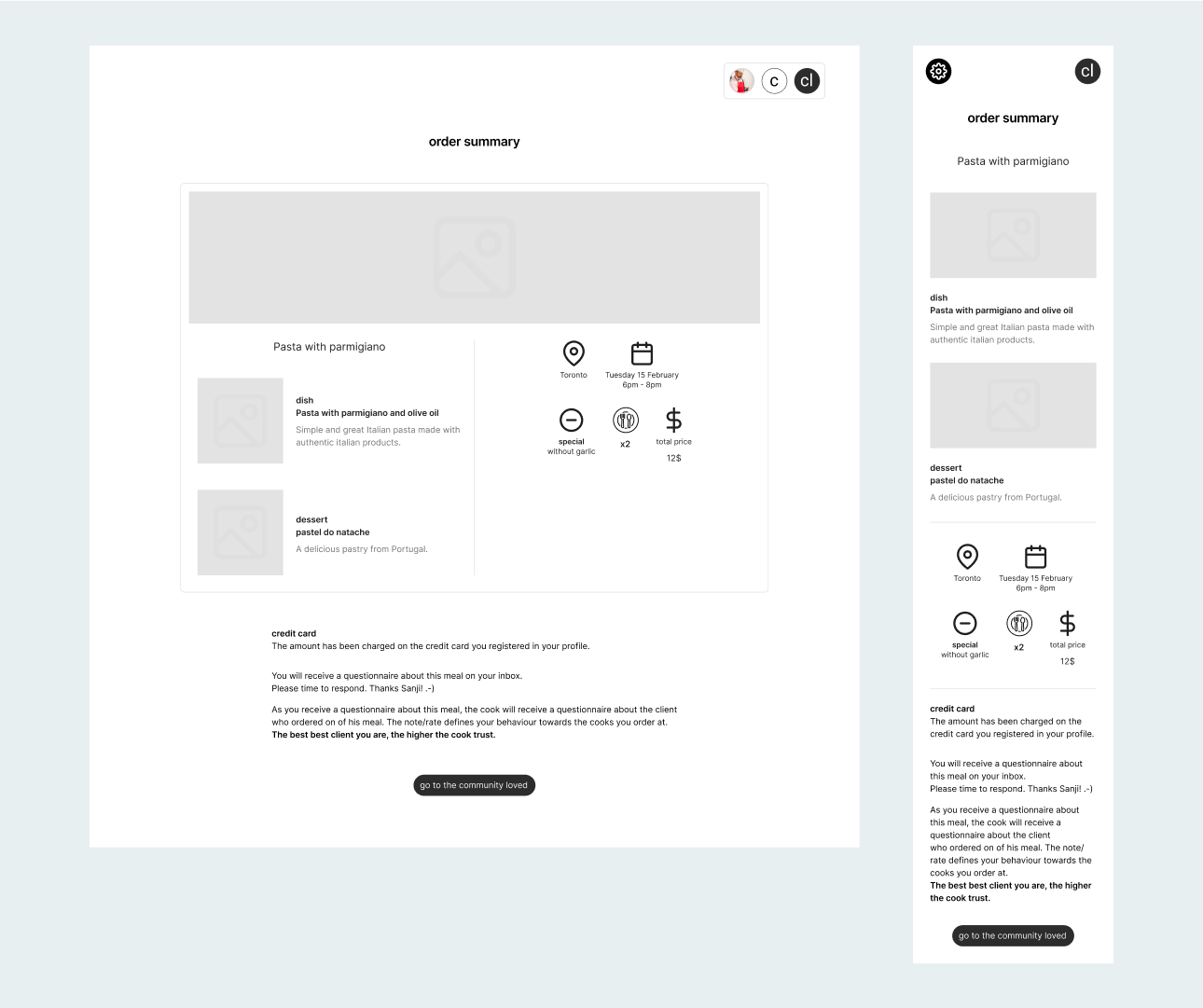 The service is a platform that allows a person to cook for someone else (CtoC). A person can be asked to cook for many situations. It can be for a diner or an commercial event. A client can also be a cook, not just ordering dishes from other cooks, and cook at someone else’s home or event.