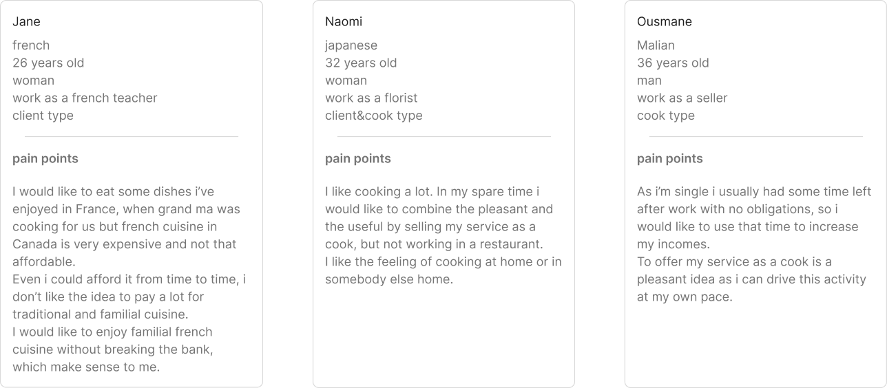 We defined multiples personas, that would become for us the possible user types, and drawn users journeys around it. Then followed the wireframing phase to give form to our assumptions and the prototyping to have a view and a flavour of what users might experience.