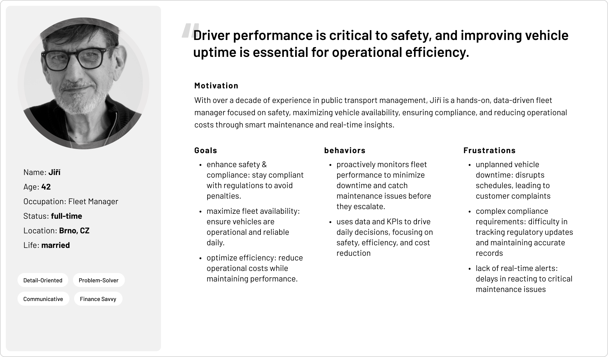 Through generative research, I gained early insights that informed a persona, clarifying both the fleet manager’s responsibilities and the decision-making challenges they face daily, as outlined below.