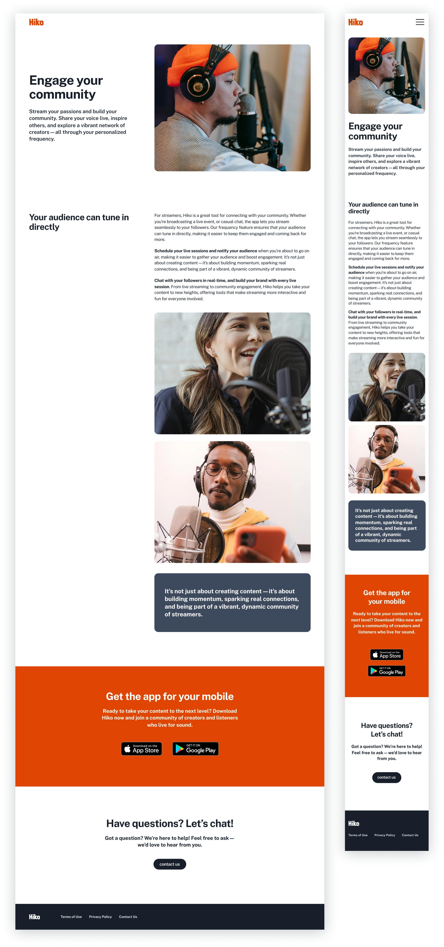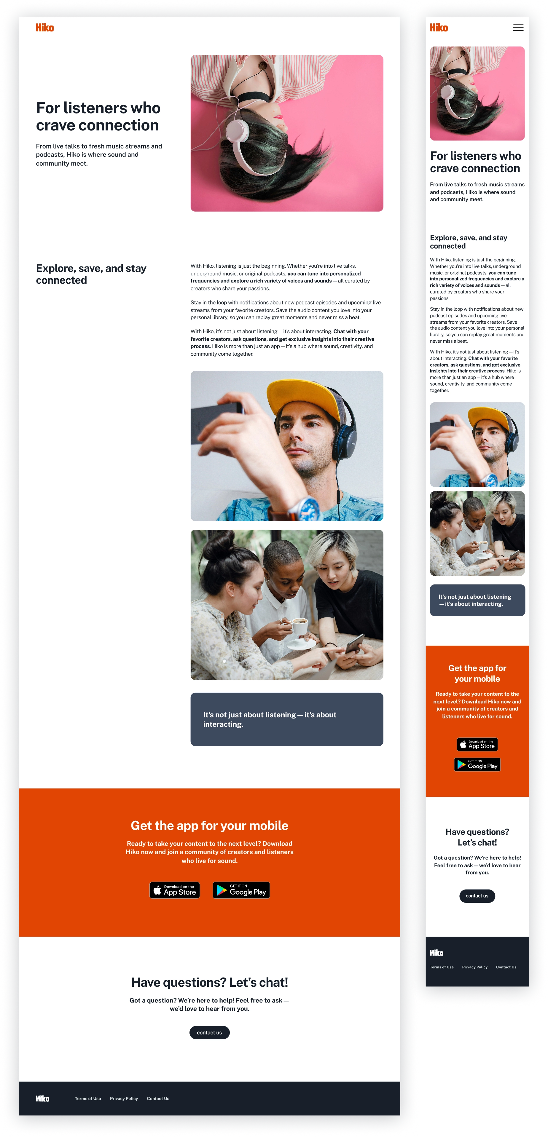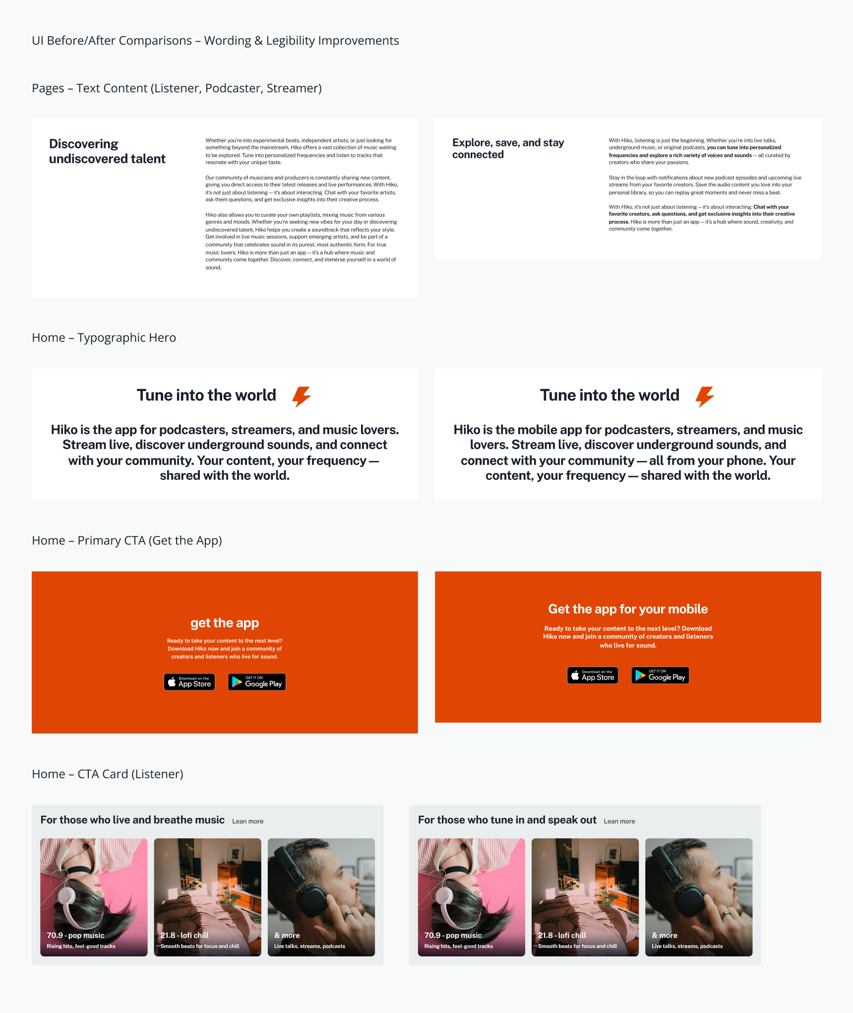 This research built a dual perspective: listeners needed easier exploration and saving, while creators needed visibility and connection. The website had to appeal to both groups and clearly reflect how Hiko could serve them.