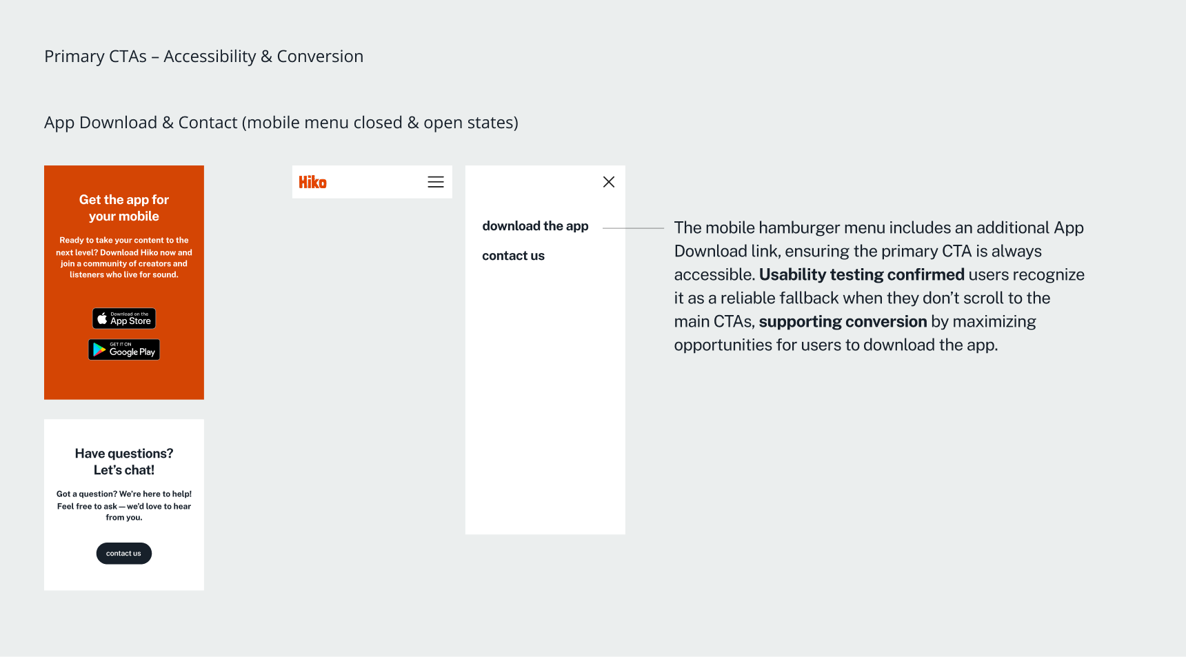 When approaching the SPA redesign, I hypothesized that users were unsure what Hiko was or why they should try it. Addressing information hierarchy, interactivity, and messaging would directly impact usability and app downloads.