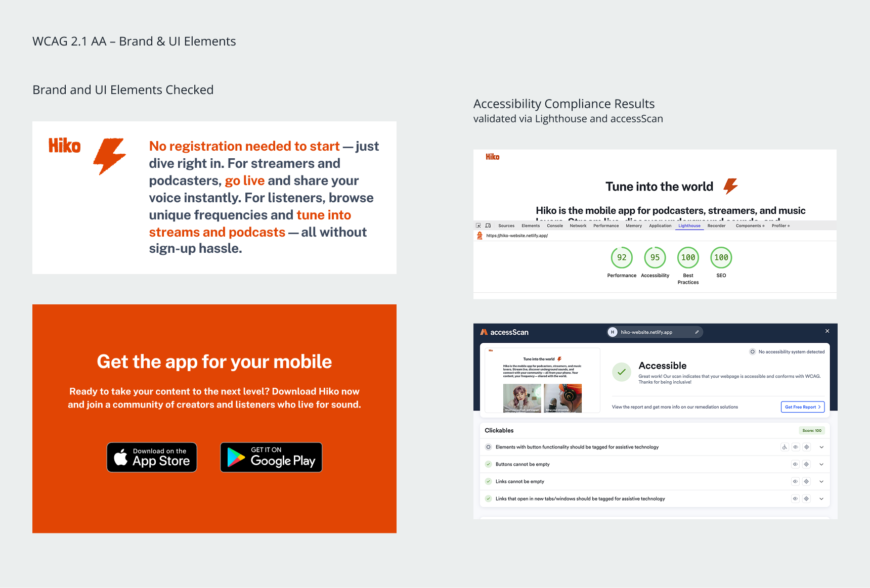 The result is a responsive website, designed and tested across desktop, tablet, and mobile, that no longer hides the value of Hiko but surfaces it — clearly, confidently, and cohesively. Alongside the website, a complete visual identity was delivered, including logo, color, typography, imagery, and tone guidelines, reflecting the app’s spirit while improving accessibility, clarity, and storytelling.